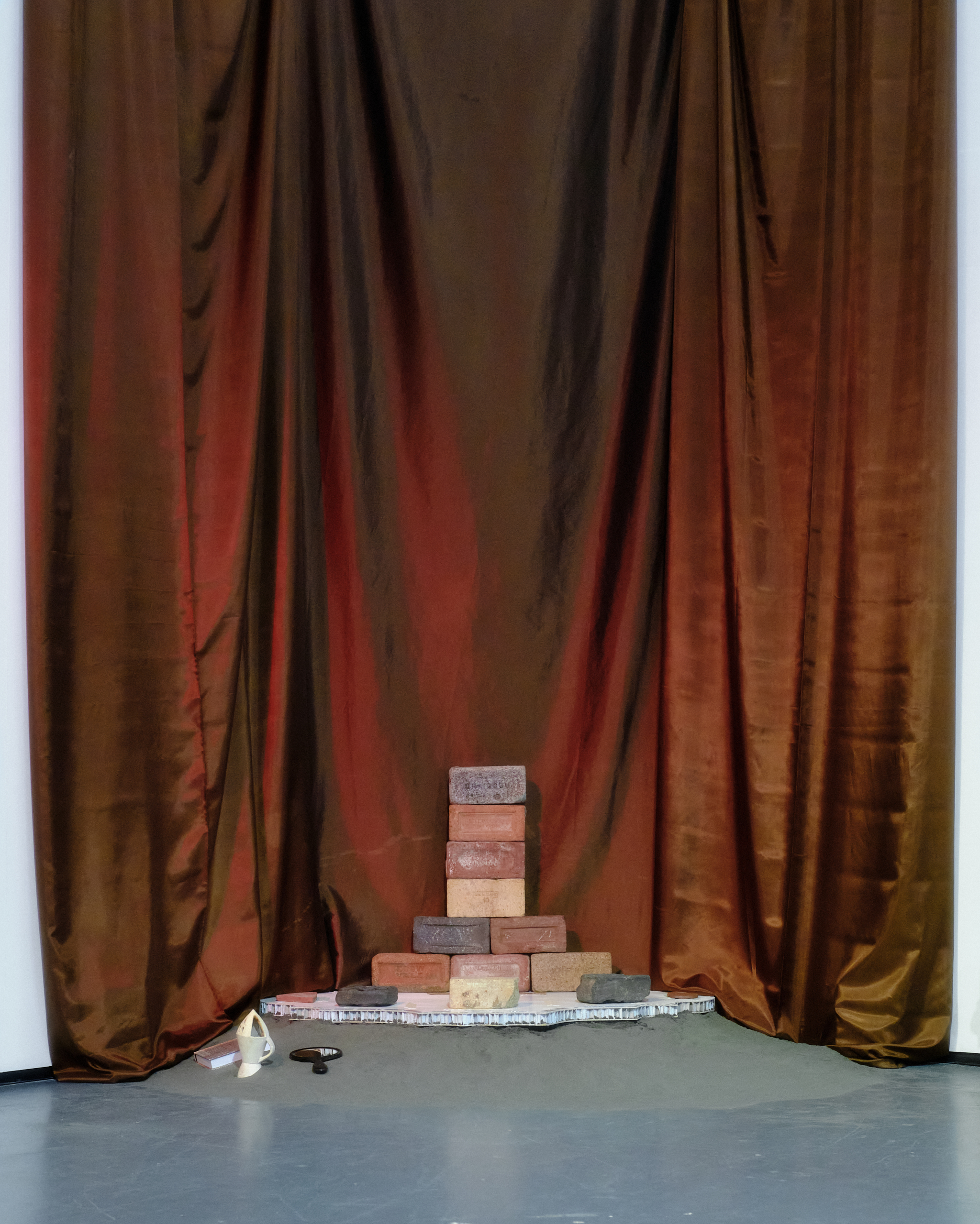 The vocalisations that lay the foundation of this soundpiece are a collection and layering of sounds recieved from the bricks the artist collected to make their shrine work ‘Vessel Vestige’ (see below), and that the artist understands to be a imparting of the divine grace that makes legible the spirit not only of the clay that these bricks were made from, but also the connection to the labourers that made and laid these bricks. These sounds are paired with the artist’s meditation on the embodied experience of manual labour.