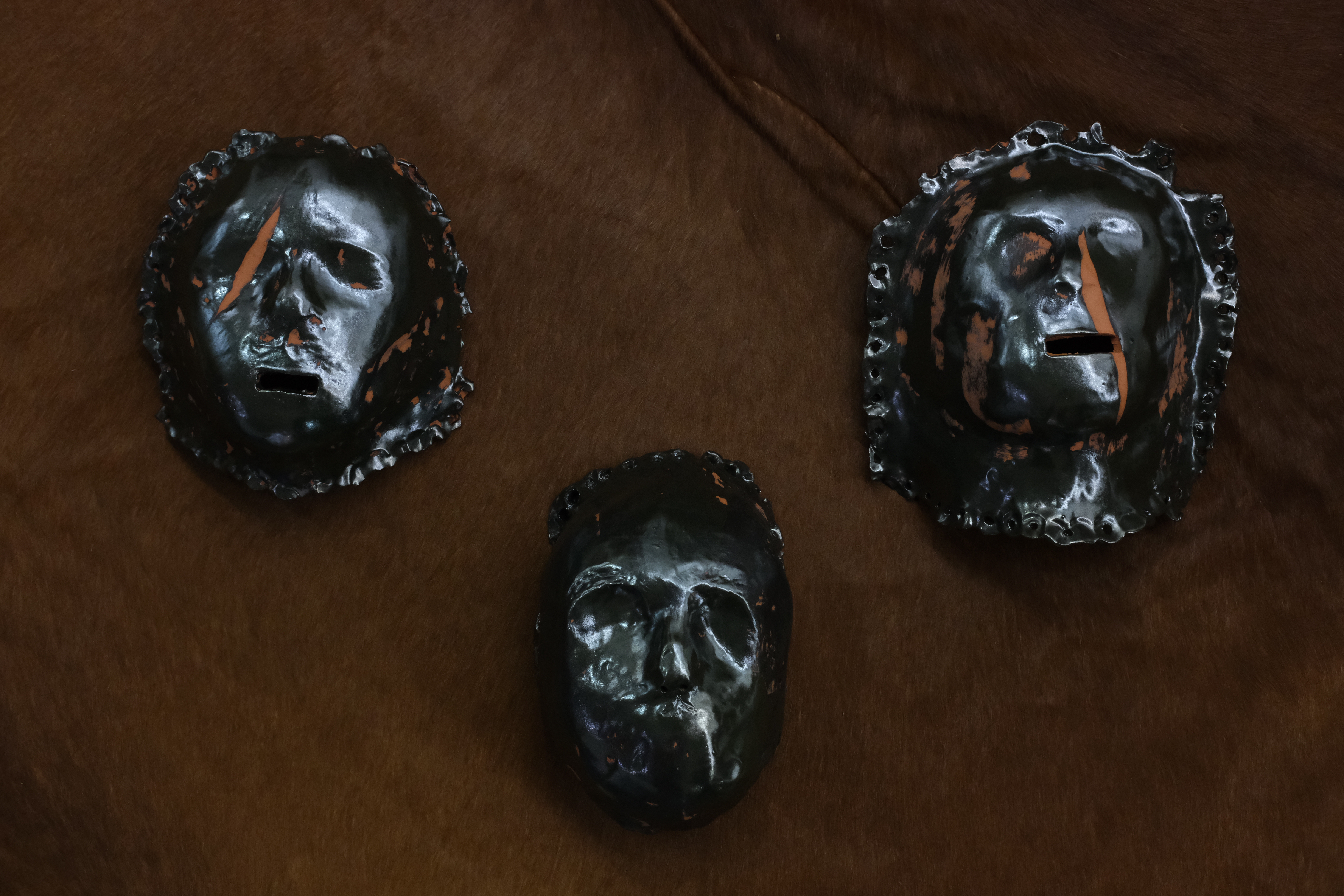 The Ruux Kholvawala or ‘Soul Openers’ are 3 ceramic masks handmade by DARCH. They take inspiration from ceremonial masks and are used to communicate with the spirits of earth to translate their pain, grief, joy and teachings to the human world. In performances one mask is worn by Umulkhayr, one by and Radha and the other is offered to the spirits. In this way, we challenge and reject a common narrative in climate activism that the Earth needs 'saving' or that the duty of humans is to ‘save’ the Earth. Instead we believe that we must respect the Earth’s agency by first asking what it wants and respond to its needs before making assumptions.